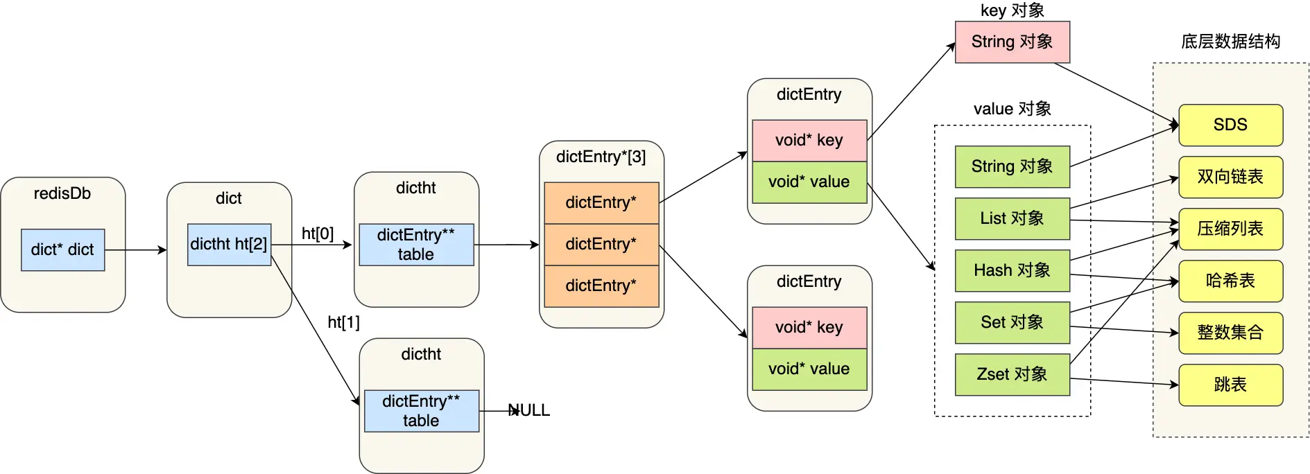 哈希表其实就是一个数组,数组中的元素叫做哈希桶。哈希桶存放的是指向键值对数据的指针(dictEntry*)。